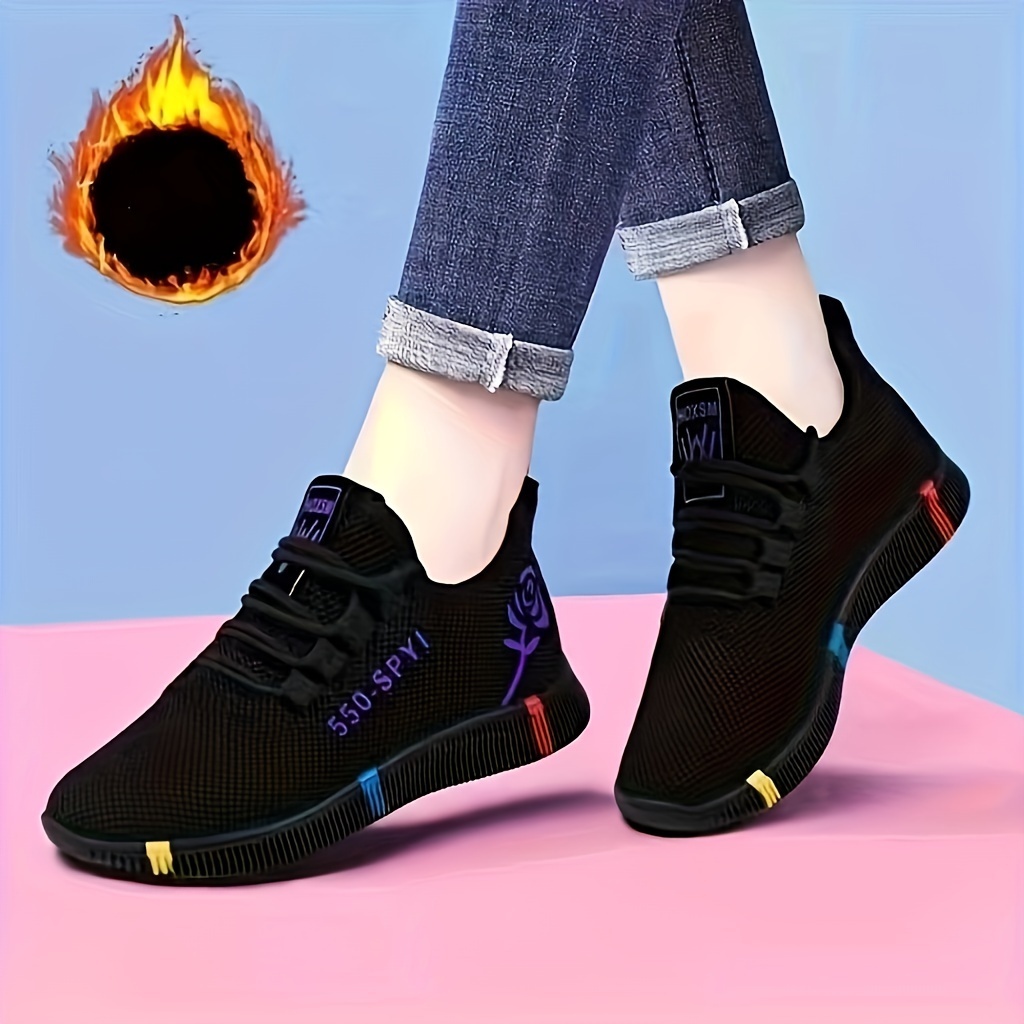 Women's Rose Pattern Sneakers, Thermal Lace Up Low Top Running Trainers, Casual Outdoor Plush Lined Sports Shoes